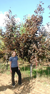 My apologies for not blogging lately, but I was on holidays.  And as usual when you go on holidays there is much to do before you leave and lots to catch up on when you get back.  While we enjoyed the nice beautiful hot weather by the lake, when I got back you can imagine my horror to seeing how the plants are coping with the heat.  Alot of the Japanese Maples leaves’ are burning as well as many of the other trees, some are defoliating altogether.  But one Japanese Maple is sitting out in the bright sun and doing well – and it is my favourite.  I take billions of pictures around here and I always take some of that guy.  It’s funny cause when it was little he didn’t look so good – so we put him in the back field where he couldn’t be seen.  Now look at him!  Cinderella story or what!  When customers come in I always point out my beauty tree but don’t really make an effort to sell it.  They always ooh and ahh on how beautiful it is! And expensive!  So I am confident my tree will be here for a while.  It was a beautiful bright red in the Spring and looked great against the evergreens and the Princeton Maple.  And it is still a nice red now – can hardly wait til fall.  So you can imagine my horror when a couple was interested in the tree.  Oh – how they tried to show them something else but the couple kept coming back to that tree.  And then -egad – they bought it!!!  Agggh!  And then to add more pain – they wanted it the next day!  Not alot of time for parting photo ops!  But I did.  I waited til the end of the day for the sun not to be so bright and then I could catch the red of the leaves.  They dug it after I left and it was already tarped when I got it in the next morning.  What!!!! So I told the crew leader who was planting it that day to phone me when he was close to the customer’s house so I could come down and take some photos.  The clients who purchased the tree were fine to let me take some photos (they were very nice!).  So I happliy clicked away.  I must say it looks beautiful in front of their home, but the island bed where it stood looks naked.  It’s weird how you get attached to some things. And I must say – I miss my tree.  Really – I mean it is a tree for pete’s sake!  I have billion things to blog about but today it is about my tree.  The client’s said they would send some pictures of my baby when the landscaping is done – hope they do!