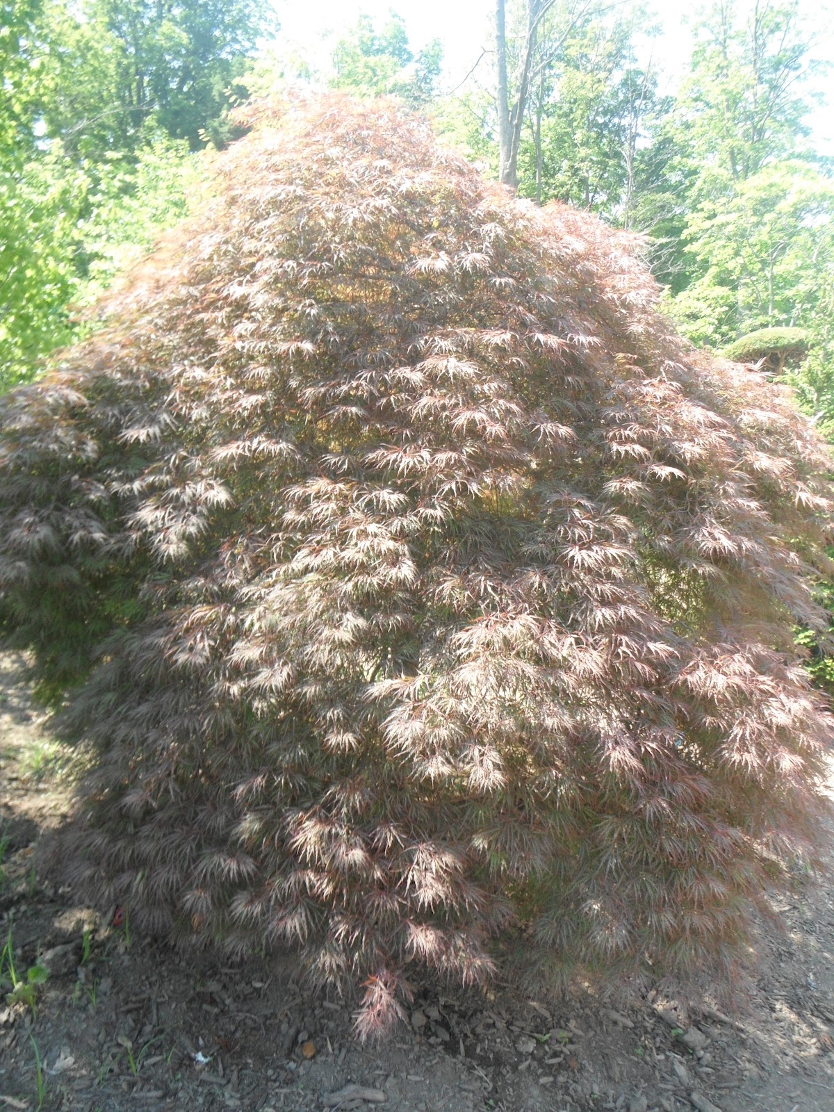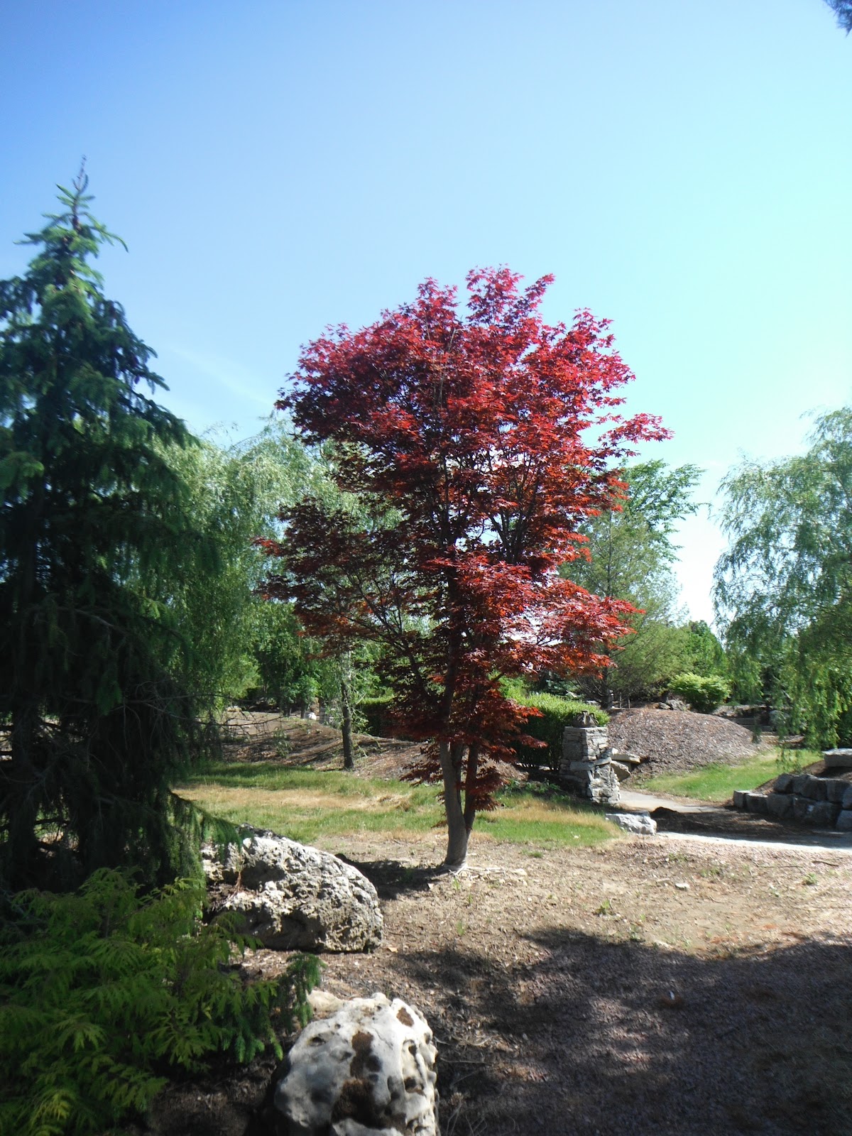 Japanese Maples come in many shapes and sizes and of course many variances of colour. There are green varieties and red varieties, weeping forms and upright forms. Of course every tree had it’s own character and personality and it seems it depends one what time of day you look at the tree. They are slow growers and the red ones have an intense red colour in the fall.The green ones turn a beautiful yellow colour. The weeping varieties have lovely lacy foliage and mounding forms. Take a look at some of the pictures below and see if any tickle your fancy. The Ivory Silk Lilacs are in bloom and look spectacular against the blue sky!