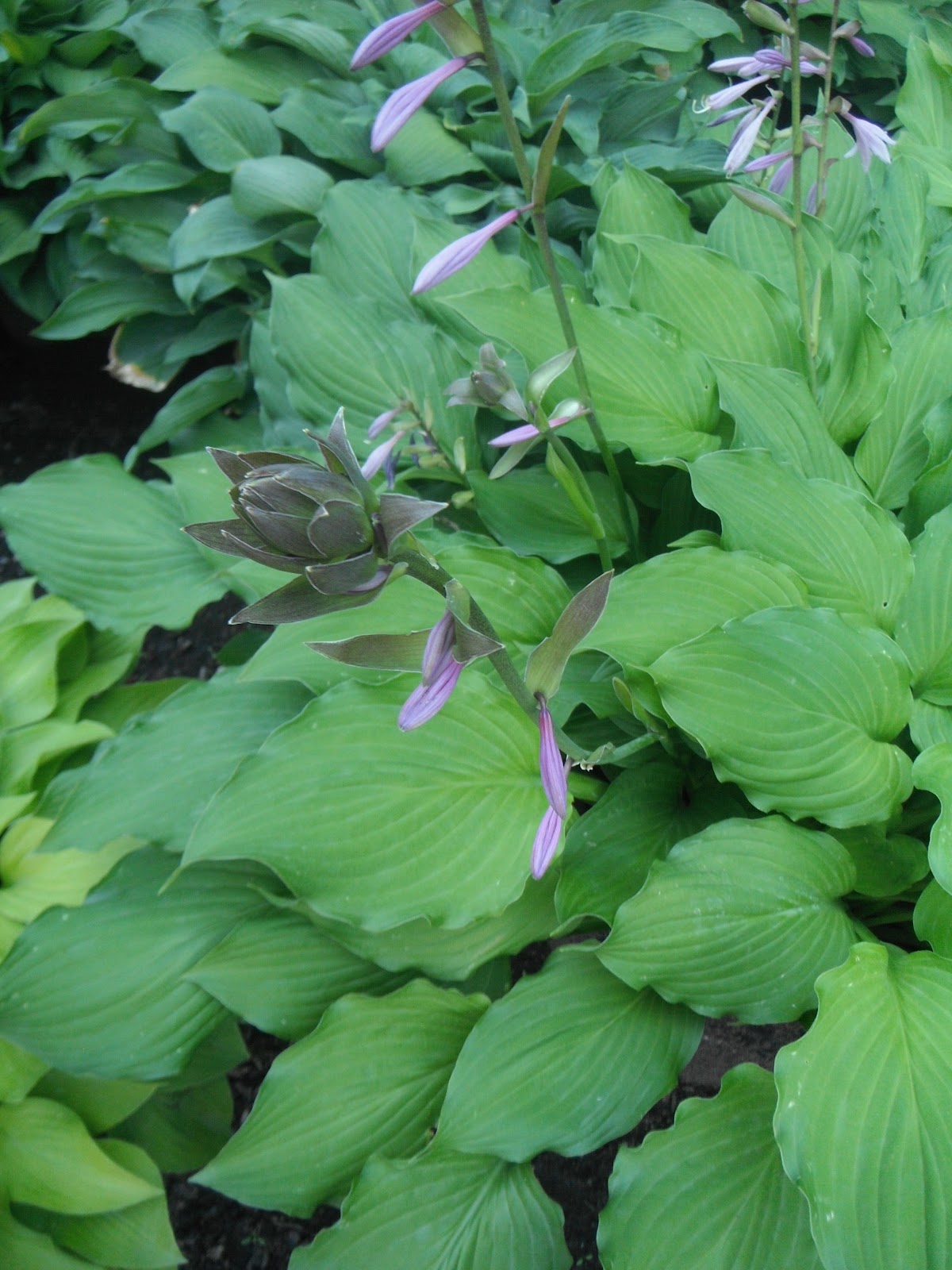 It is already the middle of June – where has the time went? Within a week the Amelanchier berries have ripened and we have been sampling them along with the birds. The Dawycki Gold Beech trees have spectacular gold foliage I noticed while eating berries so I took a picture. In the Spring they were brighter and they will return to that brightness in the fall. These columnar plants are small now – only 10′ to 12” feet but they will be spectacular in a few years. The Hydrangea Standards are just pushing to bloom and there should be some fabulous photo ops next week. The mulberry trees are fruiting – I went to pick some berries to eat and it took days to get the purple juice from the berries off my fingers. The birds love them, they are really pretty colours with a combination of pinkish, red or purplish violet multi drupe berries. The trees are nice and full with their weeping form. The Gledistias are now forcing out new growth – spectacular yellow new foliage looks neat against the lime green older leaves. Beside them in the field is the Paperbark Maple. I noticed it because of all the neon green keys (seedlings). These are one of my favourite trees. The picutre doesn’t do it justice but the bark of the Paperbark Maple is similar to that of a Birch only it is brown in colour which looks magmnificent in the winter. Not to mention the bonus of beautiful red fall leaves – so typical of the maples. Some of the plants that arrived last week are now healed in their beds. Check out the huge Japanese Maple – just gorgeous! And look how the sculpted pines look in the ground – looks like they have been there forever. The Hostas are starting to bloom – I could almost do an article on them alone! Next blog I will focus on the island bed – and add some of the pictures I took this week. Too many trees, too many plants, too many pictures, too much to say…I almost have to start doing this daily!